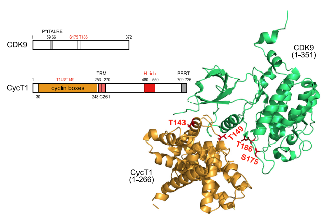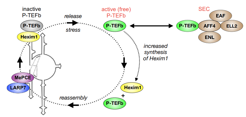 正转录延伸因子 b (P-TEFb) 由细胞周期蛋白 T1 或 T2 和细胞周期蛋白依赖性激酶 9 组成,通过 RNA聚合酶 II 调节转录的延伸阶段。通过拮抗负延伸因子和磷酸化 RNA聚合酶 II 的 C 末端结构域,P-TEFb促进新生转录物的延伸和共转录加工。这一步对于大多数真核基因的表达至关重要。在生长细胞中,P-TEFb通过其与7SKsnRNP中的HEXIM1/2的可逆结合而受到负调控,并通过许多转录因子以及超延伸复合物受到正调控。在静息细胞中,P-TEFb分解,细胞周期蛋白 T1 被蛋白酶体降解。P-TEFb的这种复杂调节已经进化为对生物体中基因表达进行精确的时间和空间调节,其失调会导致炎症和肿瘤性疾病。
