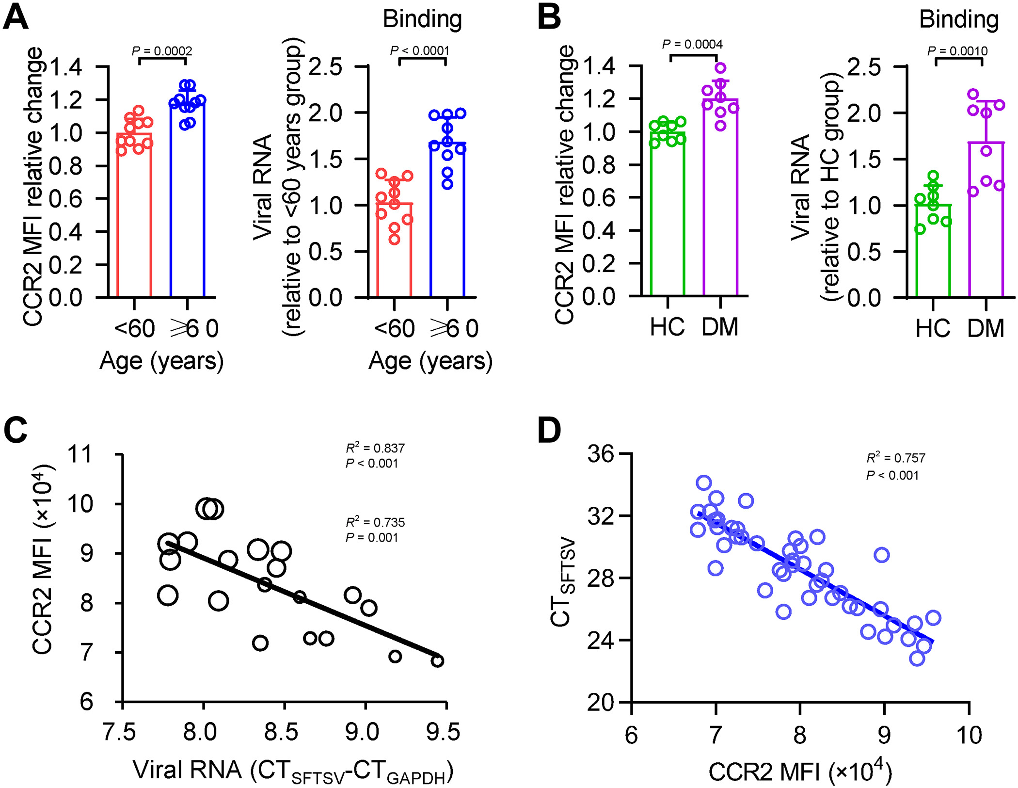 该研究通过基于CRISPR-Cas9的全基因组筛查,确定了CCR2是SFTSV进入的关键宿主因子。通过生化试验以及小鼠模型验证了CCR2在SFTSV感染过程中的受体作用。并解释了临床上外周血原代单核细胞高表达CCR2的老年个体和糖尿病(DM)受试者对SFTSV更易感,从而揭示了为什么这些人具有更高的致死性SFTSV感染风险,这一结果具有临床意义。