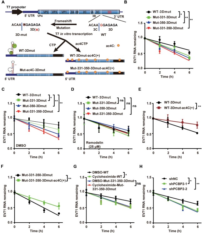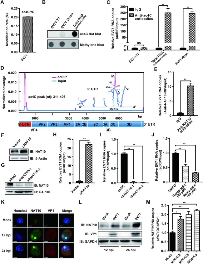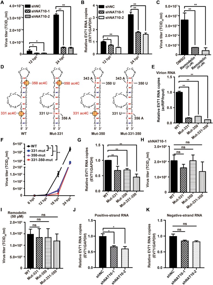 针对这一重要科学问题,该论文以经典RNA病毒EV71为对象进行了深入探索。研究发现EV71通过改变宿主乙酰转移酶NAT10的细胞定位及表达水平,促使自身5'非翻译区中的IRES区域形成ac4C修饰,而这些ac4C修饰促使病毒进行更为有效的复制。进一步研究发现ac4C通过促进IRES与PCBP2的结合增强病毒RNA翻译进而提高RNA的稳定性。另外,ac4C还可增强病毒 RNA与3D蛋白的结合能力及病毒在小鼠中的致病性。该研究不仅揭示了ac4C调控病毒感染的分子机制,同时为RNA病毒的防治提供了新的思路和可能的药物靶标。