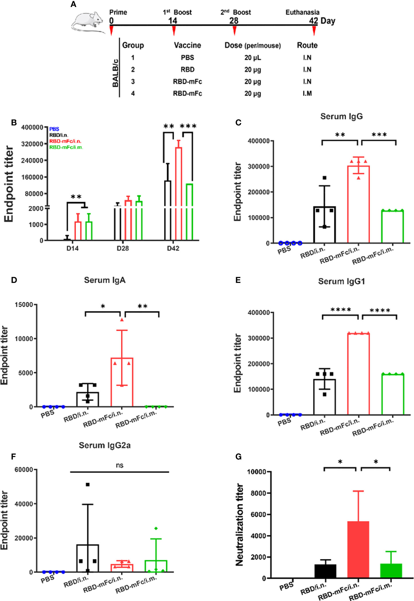 严重急性呼吸综合征冠状病毒2型(SARS-CoV-2)已在全球范围内持续流行。由于变异毒株的迅速出现,迫切需要新型疫苗和疫苗接种策略。该研究设计了由新冠受体结合域(RBD)与抗体Fc片段融合(RBD-Fc)的鼻内疫苗。RBD-Fc可通过鼻内接种诱导强烈的体液免疫应答。这种免疫原可以有效地诱导IgG和IgA,并在呼吸道中建立粘膜免疫。诱导的抗体可以有效地中和野生型SARS-CoV-2和目前识别的SARS-CoV-2变异株,包括奥密克戎变异株。在小鼠模型中,鼻内免疫可以对抗新冠病毒的致命攻击。