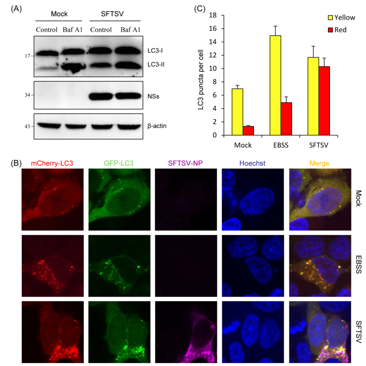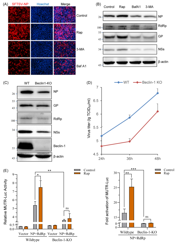 除了维持细胞内稳态,自噬正成为宿主防御多种感染的关键角色。该研究以SFTSV为模型,提出了一种新的病毒机制。SFTSV感染触发自噬,导致完全的自噬通量。从机理上讲,该研究发现SFTSV的非结构蛋白(NSs)通过靶向其激酶结构域与自噬的关键调节因子mTOR相互作用,并将mTOR捕获到NSs自身诱导的病毒包涵体(IBs)中。药理学实验和Beclin-1敲除实验结果证明,自噬反过来增强了SFTSV的感染和传播。基因组报告系统揭示了SFTSV核糖核蛋白的活性可以通过自噬来增强。该研究还发现SFTSV相关布尼亚病毒的NSs蛋白具有靶向mTOR的保守功能。该研究揭示了一种通过与mTOR相互作用诱导前病毒自噬的策略,将mTOR隔离到IBs中,从而激发下游ULK1途径,这为病毒操纵自噬提供了一种新的模式,并可能有助于针对SFTSV和相关病原体的特异性抗病毒治疗的未来发展。