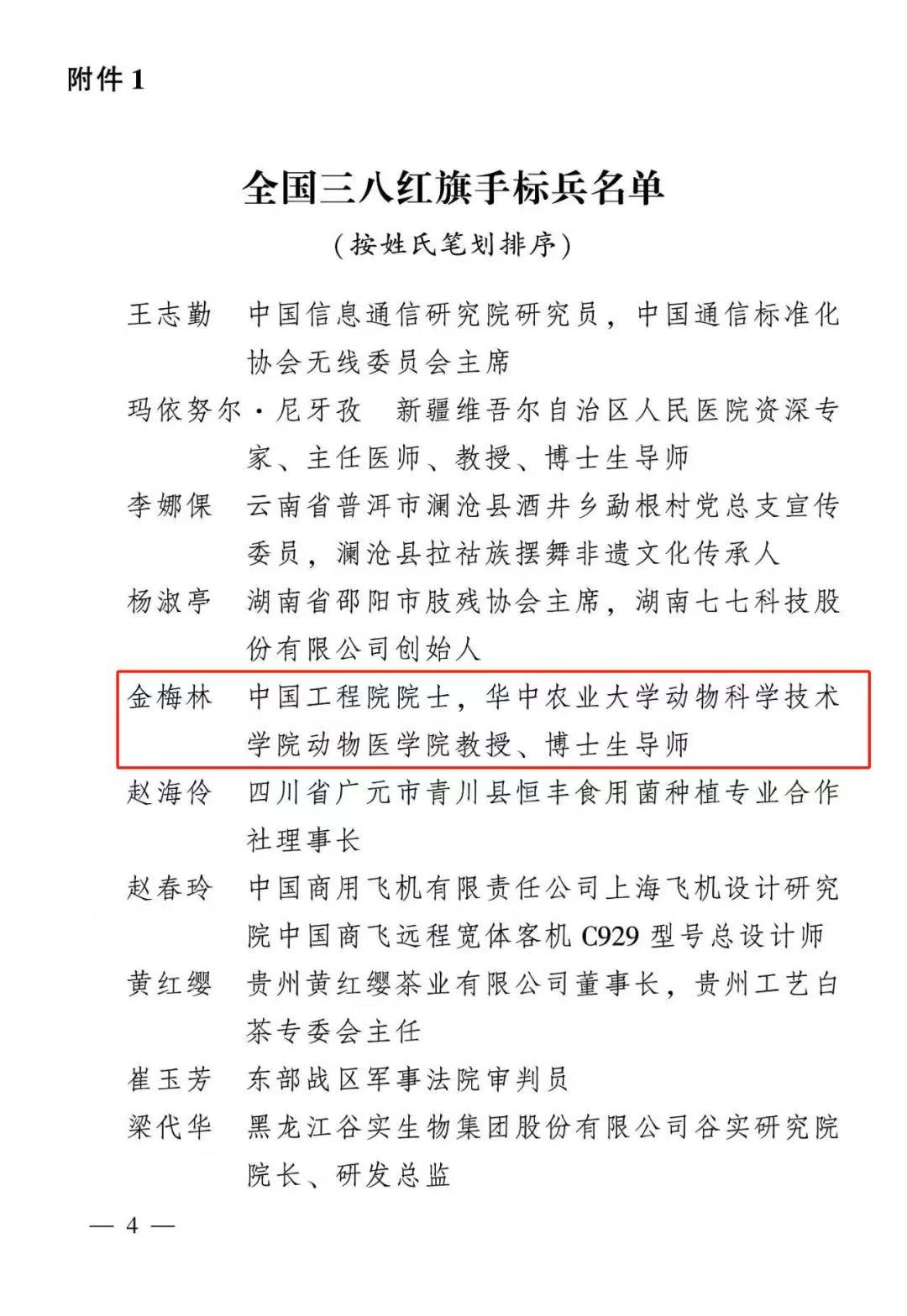 其中,中国工程院院士,华中农业大学动物科学技术学院动物医学院教授、博士生导师、湖北江夏实验室副主任金梅林荣获“全国三八红旗手标兵”。