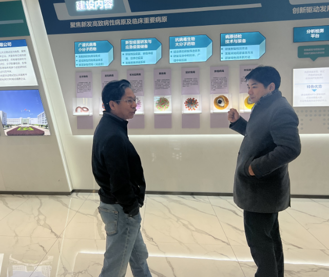 陈新文一行先后参观了江夏实验室展厅、mRNA疫苗研发中心和办公场所,关武祥从实验室概况、主要研究方向和标志性成果等方面向其介绍了实验室现阶段基本建设情况。