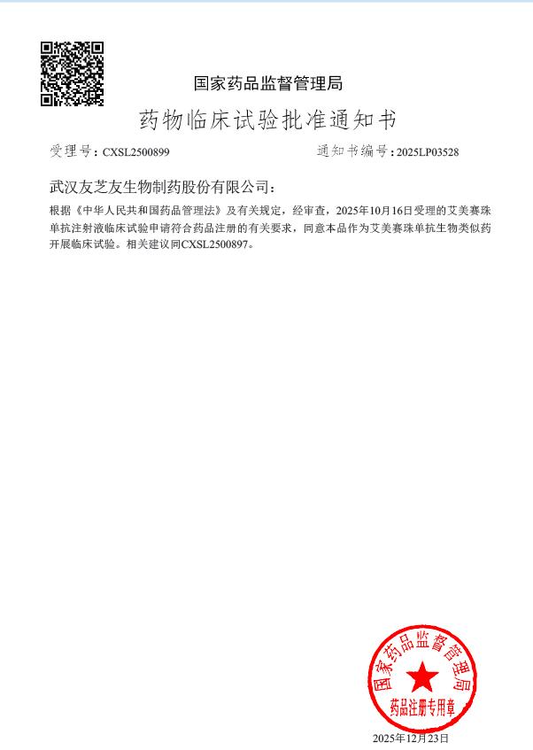 近日,湖北江夏实验室与武汉友芝友生物制药股份有限公司(以下简称“友芝友生物”)合作开发Y225项目(艾美赛珠单抗注射液生物类似药)取得重大突破,其临床试验申请于2025年12月23日已获得中国国家药品监督管理局批准。