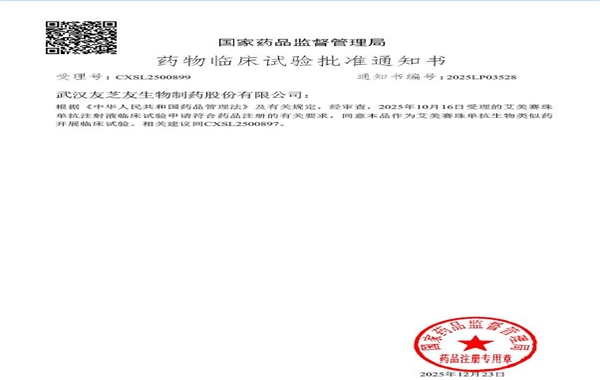 喜讯:湖北江夏实验室&武汉友芝友生物合作开发Y225临床试验申请获国家药监局批准,有望成为 国内首款艾美赛珠单抗生物类似药